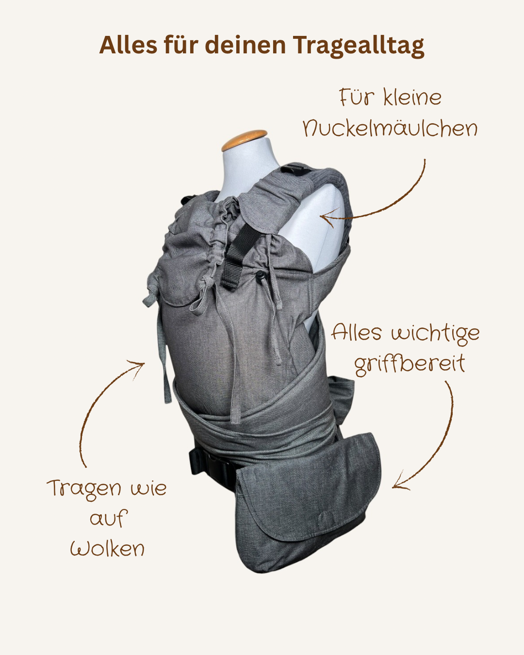 Es ist durchdacht, praktisch, wunderschön – und es trägt deine Haltung weiter: Nähe, Verbindung, Freiheit. Auch dann, wenn dein Kind mal nicht dabei ist – deine Tasche erinnert dich an euer getragenes Glück.