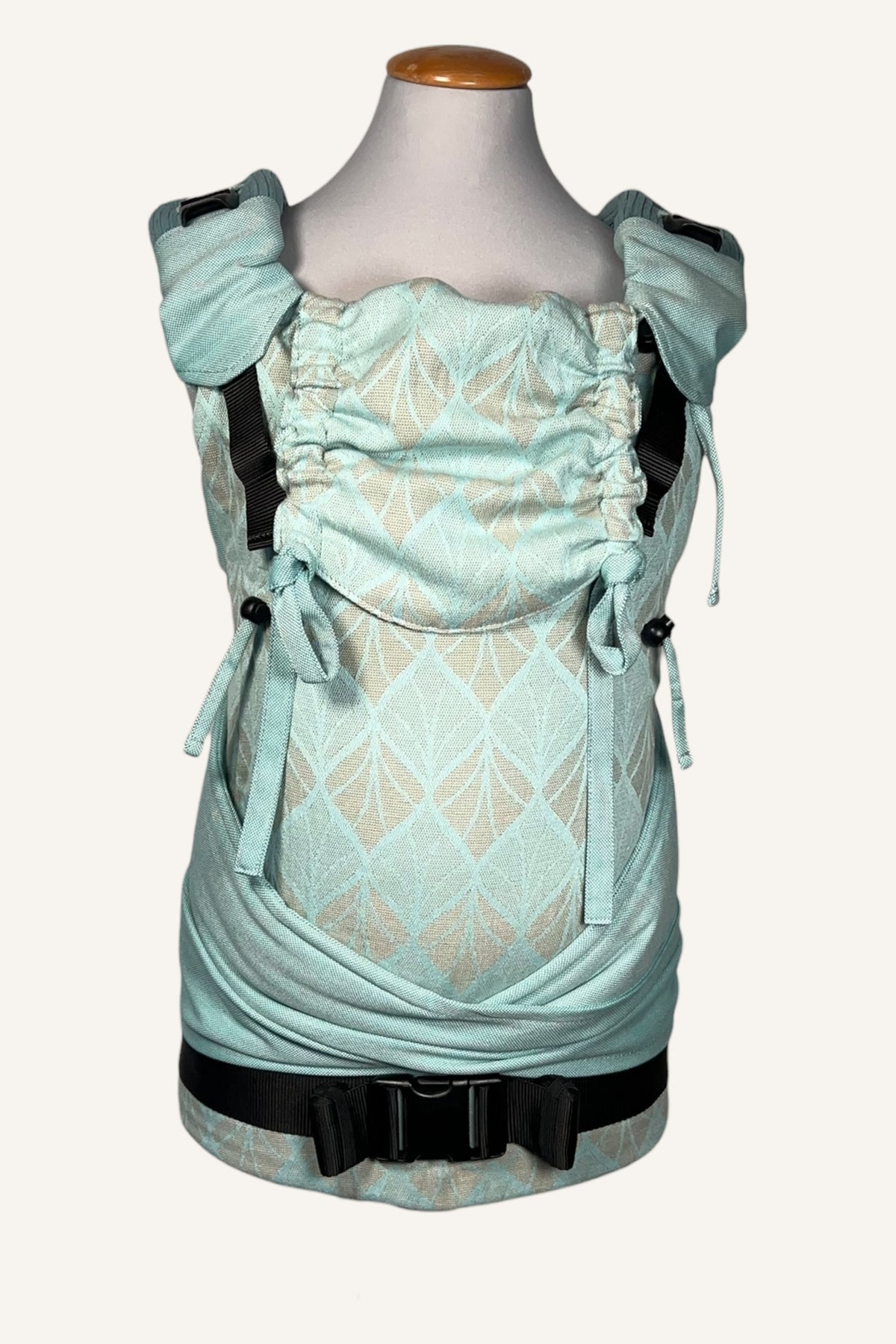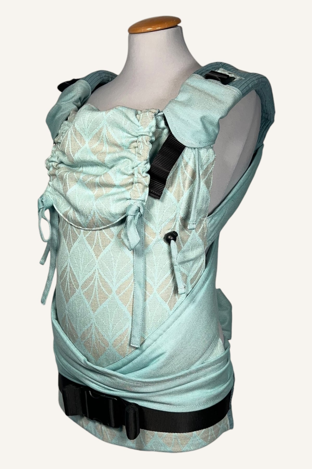 Die Gurtschoner sind genäht aus türkisfarbenen Tragetuchstoff.