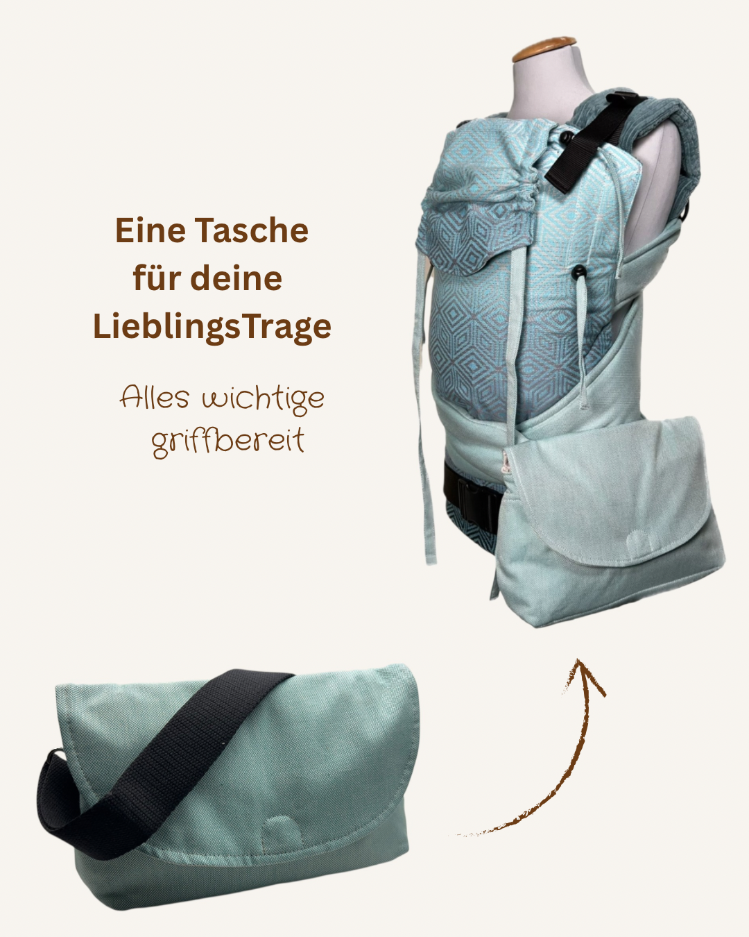 Mit dieser Tasche hast du beim Tragen beide Hände frei, bleibst flexibel und kannst dich voll und ganz auf dein Kind konzentrieren. Eine durchdachte Lösung für alle Eltern, die Nähe, Komfort und Alltagstauglichkeit verbinden möchten.